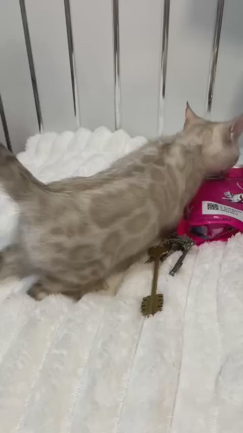 Meet Adel, an exceptional Bengal female showcasing the coveted seal spotted tabby pointed pattern. This stunning cat displays the breed's signature muscular build and wild appearance, combined with the striking contrast of seal-point coloring that deepens her exotic markings. Her spotted coat exhibits the precise rosetting and glitter characteristic of premium Bengals, while her pointed pattern adds sophisticated depth to her already captivating appearance. Adel represents the pinnacle of Bengal breeding standards, offering both visual magnificence and the breed's renowned intelligence and engaging personality. An ideal choice for experienced cat enthusiasts seeking a truly distinctive feline companion.