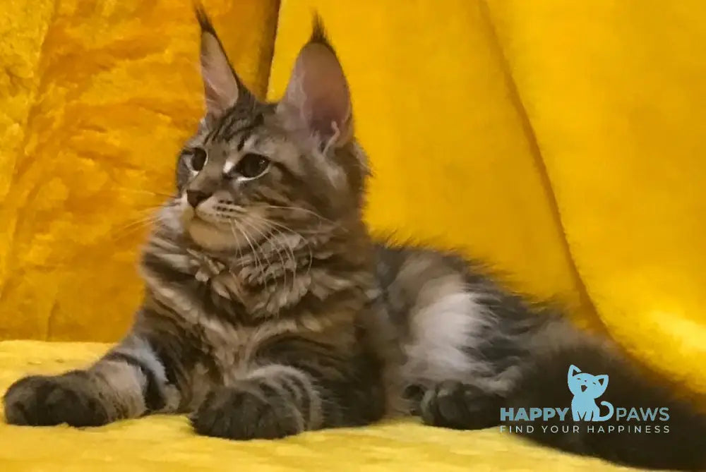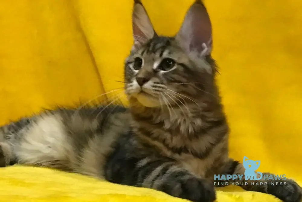 Adel is a stunning female Maine Coon with a classic black tabby coat, showcasing the breed’s signature luxurious fur and robust build. Renowned for their gentle temperament and intelligence, Maine Coons like Adel are excellent companions for families and cat enthusiasts alike. Her striking tabby pattern highlights the breed’s natural beauty, while her confident and affectionate nature makes her a valued addition to any home. Ideal for those seeking a majestic yet friendly feline, Adel combines elegance with an engaging personality.