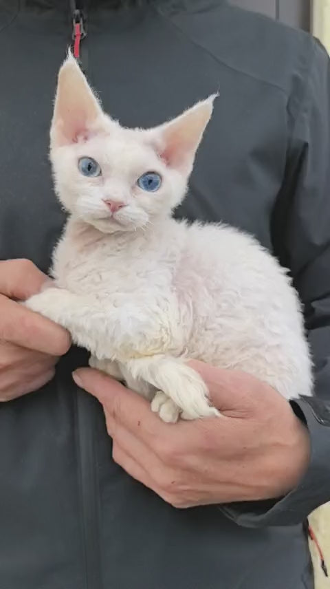 Meet Afelija, an exquisite Devon Rex female with a pristine white coat. This breed is renowned for its distinctive elfin features, including large ears, prominent cheekbones, and a slender, muscular frame. Devon Rex cats possess soft, wavy fur that requires gentle grooming and are known for their playful, affectionate temperament. Afelija combines the breed's characteristic intelligence and social nature with striking aesthetic appeal. Ideal for families seeking an engaging, interactive companion that thrives on human connection and mental stimulation.