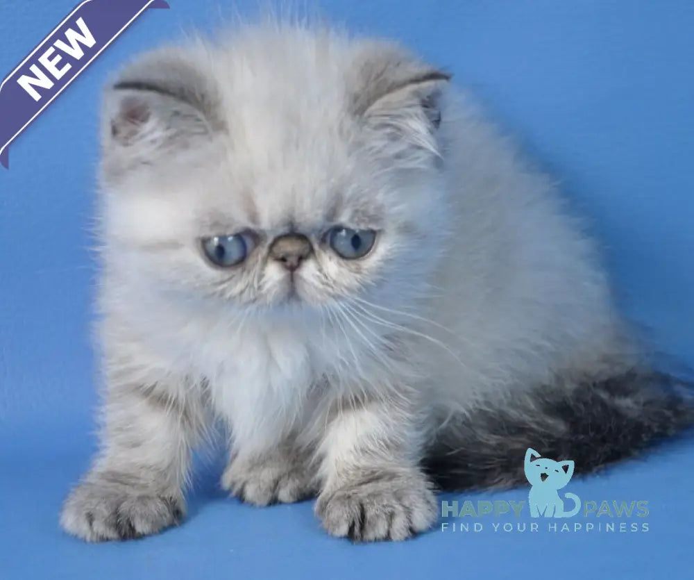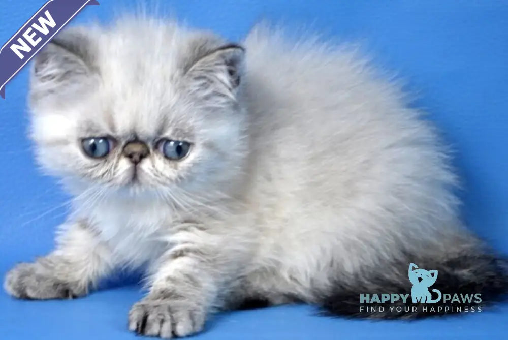 Aisha is an Exotic female with a striking seal tabby pointed coat, showcasing darker markings on her face, ears, paws, and tail. Her large, round eyes and plush, rounded features give her a sweet and expressive appearance. Calm and affectionate, she enjoys lounging in cozy spots and gentle attention from her favorite people. Aisha’s soft coat and charming personality make her a delightful companion.