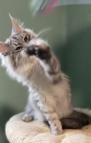 Anais is a graceful Maine Coon female with a striking black silver spotted tabby coat. Her expressive eyes and elegant build highlight the classic charm of the breed. Playful yet gentle, she easily becomes the center of attention. Anais combines beauty and a sweet temperament, making her an exceptional companion.