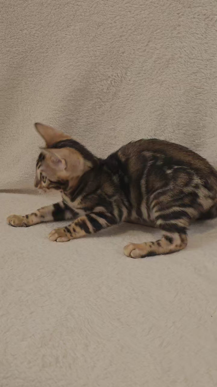 Apollo is a stunning Bengal male showcasing the breed's most coveted black spotted tabby pattern. His striking coat displays bold, high-contrast spots characteristic of premium Bengal bloodlines, combined with a muscular, athletic build. This intelligent and energetic companion exhibits the Bengal's signature curiosity and playful nature, thriving in interactive environments. Apollo's distinctive markings and confident temperament make him an exceptional choice for experienced cat enthusiasts seeking a loyal, engaging feline companion with exceptional pedigree qualities.