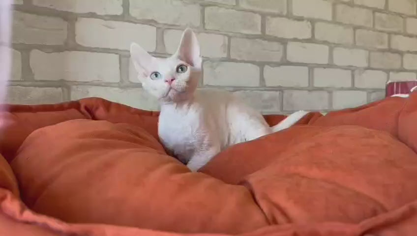 The Arahis Devon Rex male, distinguished by its pristine white coat, exemplifies the breed’s hallmark soft, curly fur and large expressive eyes. Known for their playful intelligence and affectionate nature, this cat makes an engaging companion. Its unique short, wavy coat requires minimal grooming while adding to its distinct appearance. Ideal for owners seeking an interactive, low-maintenance feline with a striking look, the Arahis Devon Rex combines elegance with spirited curiosity.