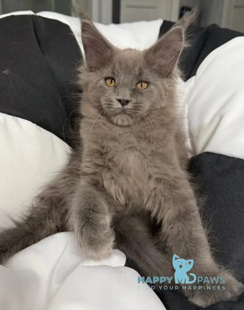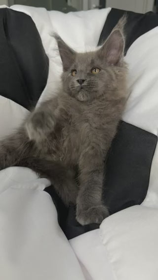 Meet Asqar, a striking blue Maine Coon male kitten with the breed's signature intelligence and gentle temperament. Maine Coons are renowned for their impressive size, tufted ears, and luxurious coats—Asqar's blue coloring showcases the breed's natural elegance. These cats are highly social, playful, and adaptable companions that thrive in family environments. Asqar combines the Maine Coon's legendary loyalty with an affectionate nature, making him an exceptional choice for those seeking a devoted feline friend with distinctive character and charm.