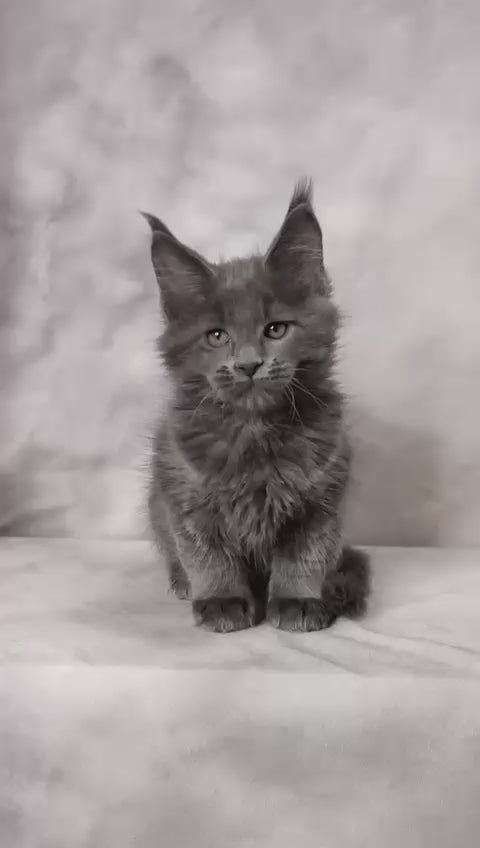 Introducing Axel, a magnificent blue silver Maine Coon male representing the pinnacle of this prestigious breed. His striking coat displays the coveted silver-blue coloration with exceptional depth and clarity, complemented by the breed's hallmark features: substantial bone structure, prominent ear tufts, and a flowing, water-resistant coat. Maine Coons are renowned for their superior intelligence, playful disposition, and strong social bonds with their families. Axel combines impressive physical presence with a gentle, engaging personality that adapts well to active households. As a male of this caliber, he embodies the breed standard's excellence—commanding yet approachable, with the distinctive charm Maine Coons are celebrated for.