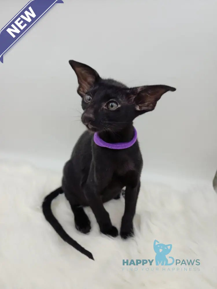 The Aznav Oriental Shorthair male in black showcases a sleek, muscular build with a glossy, short coat that highlights its refined silhouette. Known for its sociable and intelligent nature, this breed thrives in interactive environments. Its elegant appearance paired with affectionate temperament makes it a standout companion for enthusiasts seeking both beauty and active engagement.