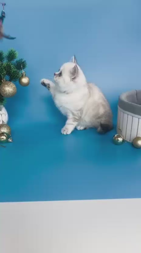 Bakara is a stunning British Shorthair female showcasing the distinctive black silver tabby pointed pattern. This breed is renowned for its robust build, plush dense coat, and calm, affectionate temperament. The silver tabby pointed coloring displays striking contrast with darker points and intricate tabby markings against a silvery base. British Shorthairs are known for their intelligence, gentle nature, and adaptability to various living environments. Bakara makes an excellent companion for families and individuals seeking a loyal, low-maintenance feline with classic beauty and a sweet disposition.