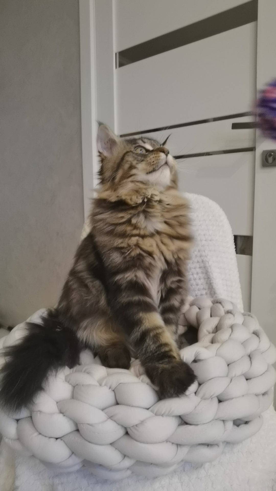 Meet Barnie, a striking black tabby Maine Coon male with the breed's signature robust build and commanding presence. Maine Coons are renowned for their intelligence, gentle temperament, and impressive size, making them exceptional companions for families and experienced cat enthusiasts alike. Barnie's distinctive tabby markings showcase the natural beauty characteristic of this majestic breed. Maine Coons thrive in environments where they can exercise their natural curiosity and social nature, forming deep bonds with their human families. With proper care, nutrition, and enrichment, Barnie promises years of loyal companionship and engaging interaction.