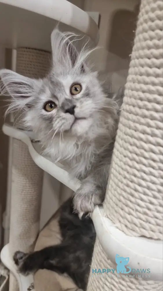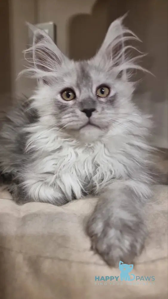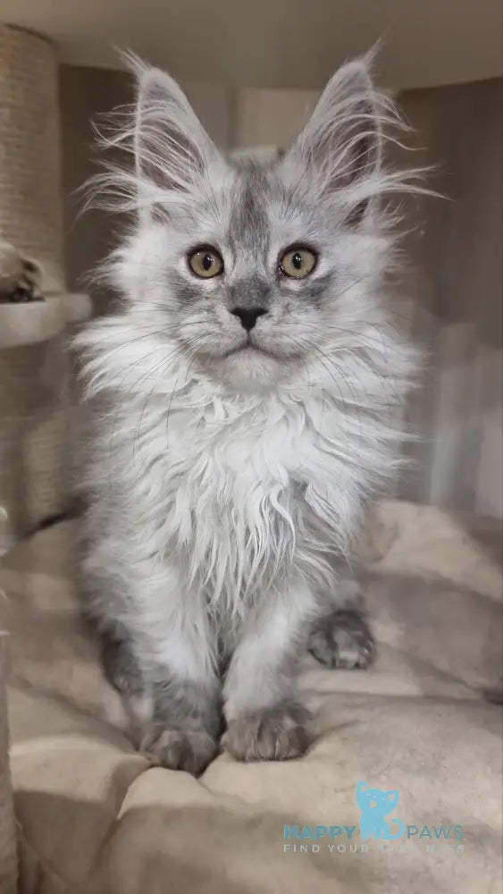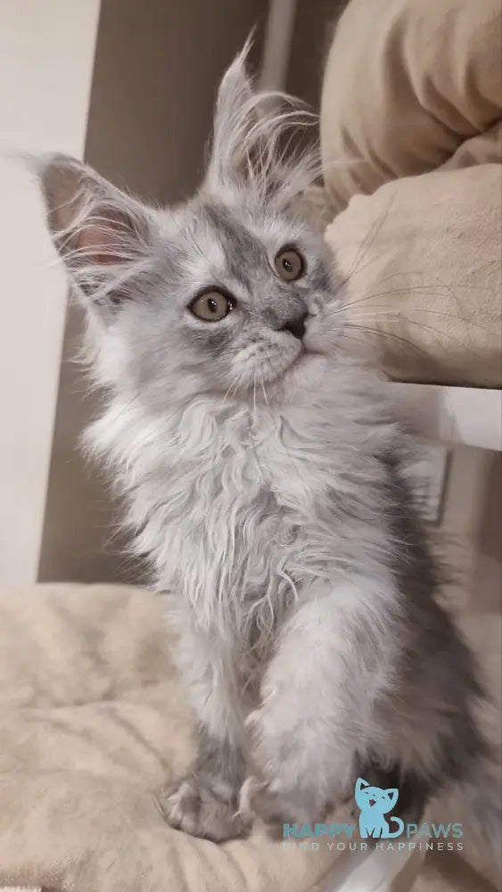 Belisa is a stunning female Maine Coon showcasing the distinctive black silver spotted tabby pattern. This majestic breed is renowned for its impressive size, intelligent temperament, and luxurious long coat. Maine Coons are known for their gentle, sociable nature and adaptability to family life, making them exceptional companions. Belisa's striking silver-tipped markings enhance her natural elegance, while her breed characteristics promise a loyal, playful personality. Ideal for those seeking a remarkable feline with both beauty and substance.