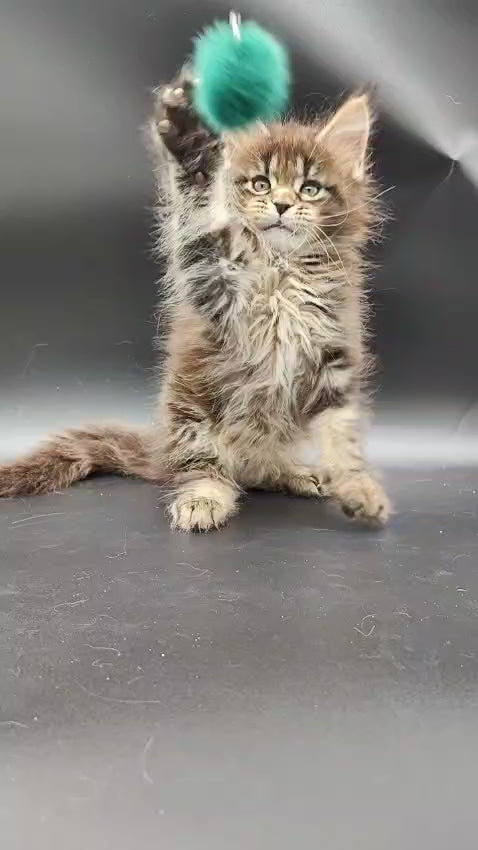 Bella is a Maine Coon polydactyl female with a striking black tabby coat. She has large, tufted ears, a strong build, and extra toes that add to her unique charm. Her bold markings and fluffy tail highlight the breed’s majestic look. Gentle and confident, she combines beauty with a friendly, affectionate nature.