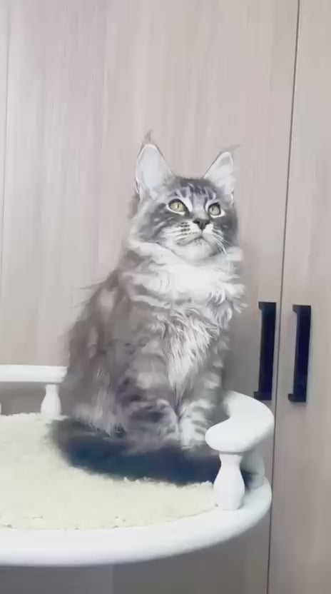 Brian is a majestic male Maine Coon with a stunning black silver tabby coat. His thick, luxurious fur and bold tabby markings give him a regal appearance. With his large build and tufted ears, he carries himself with a gentle yet confident demeanor. Brian is friendly and affectionate, always eager to bond with those around him, making him an incredible companion.