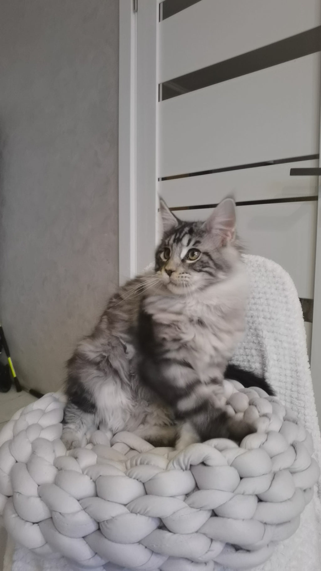 Meet your majestic Maine Coon companion. This striking black silver tabby male exemplifies the breed's commanding presence and gentle temperament. Maine Coons are renowned for their substantial size, intelligent nature, and affectionate personalities, making them exceptional family pets. The distinctive silver tabby markings enhance his already impressive appearance. Known for their playful yet calm demeanor, these cats thrive on interaction and adapt well to various living environments. Expect a loyal, engaging companion with the classic Maine Coon charm and striking good looks.