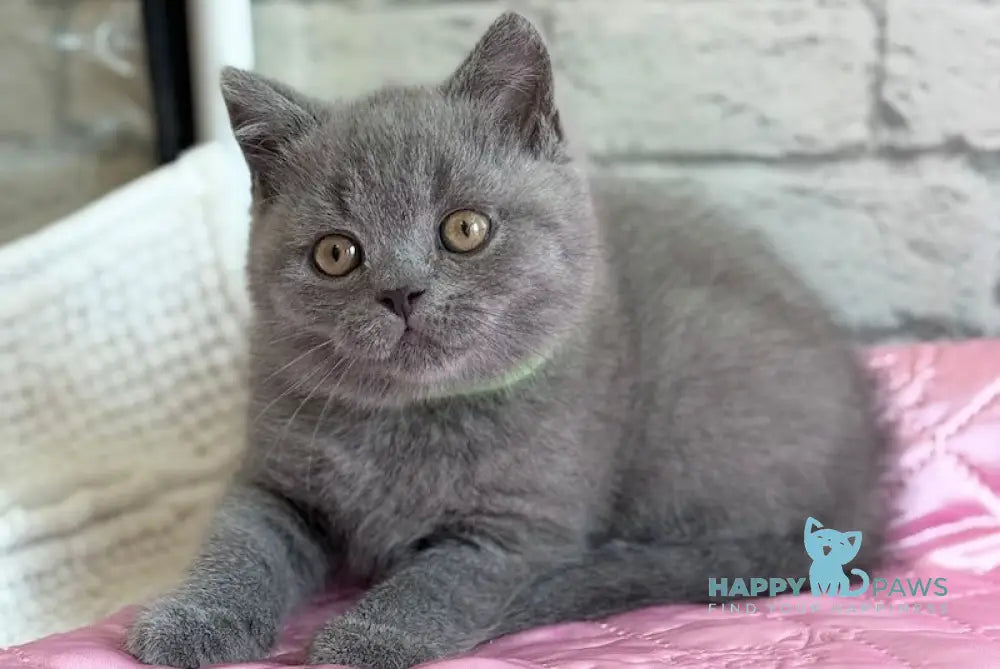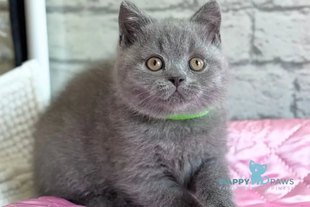 Bruce is a distinguished male British Shorthair kitten with a striking blue coat. Known for their calm temperament and robust build, British Shorthairs make excellent companions. Bruce’s plush, dense fur and round features exemplify the breed’s classic charm, promising a loyal and affectionate addition to your home. Ideal for those seeking a gentle yet playful feline friend.