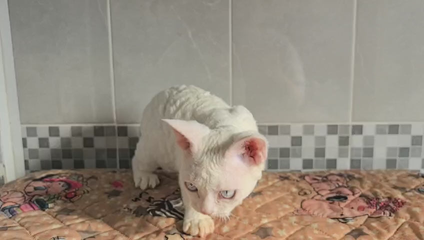 Meet Brusnika, an exceptional Devon Rex female with a pristine white coat. This breed is renowned for its distinctive elfin features, including large ears, prominent cheekbones, and a slender, muscular frame. Devon Rex cats possess soft, wavy coats that require gentle grooming and thrive on human companionship. Brusnika's white coloring showcases the breed's elegant appearance while her playful, intelligent nature makes her an engaging companion. She exhibits the characteristic Devon Rex curiosity and affection, bonding closely with her family. Ideal for those seeking an active, social cat with a unique aesthetic and devoted personality.