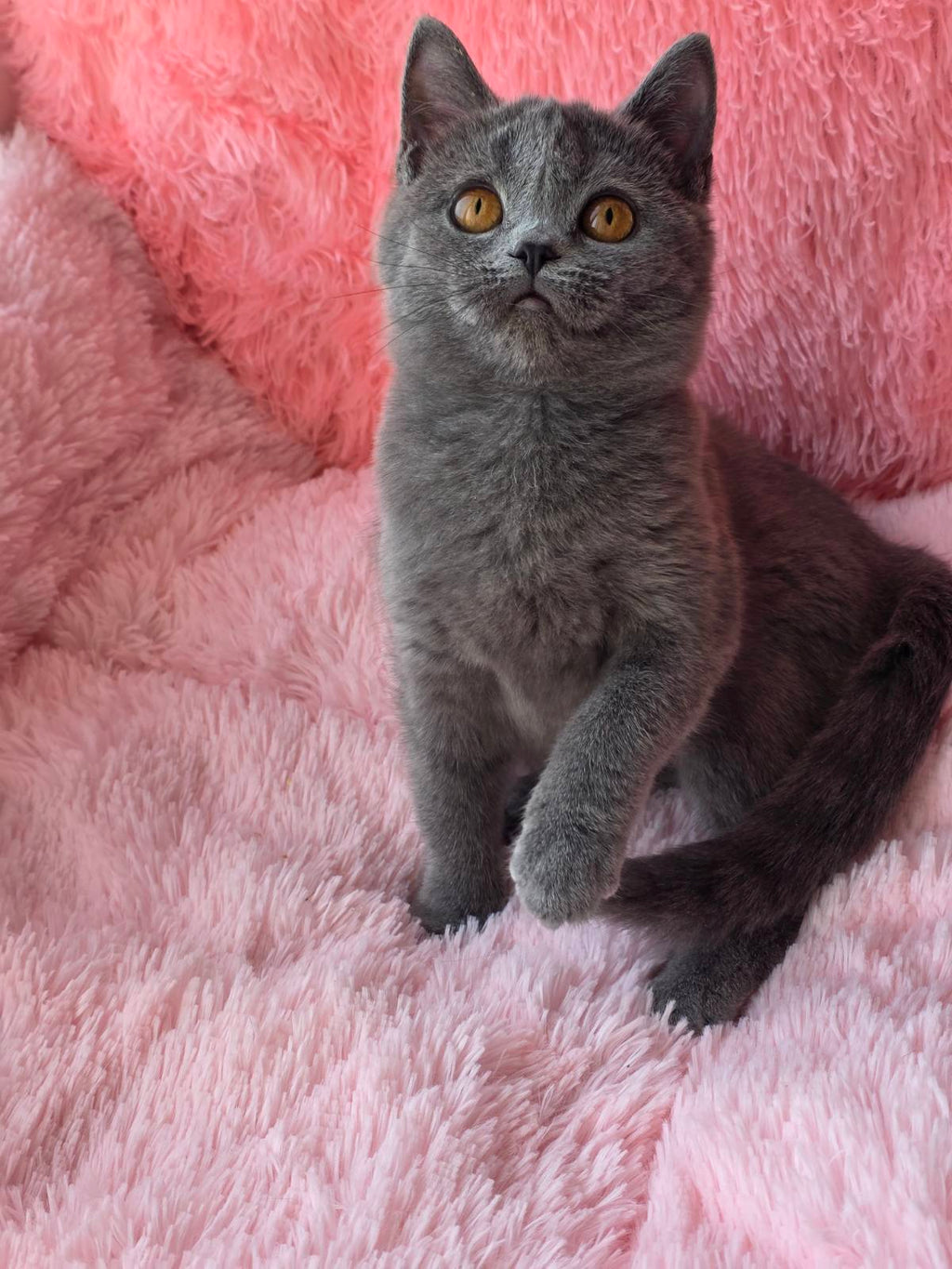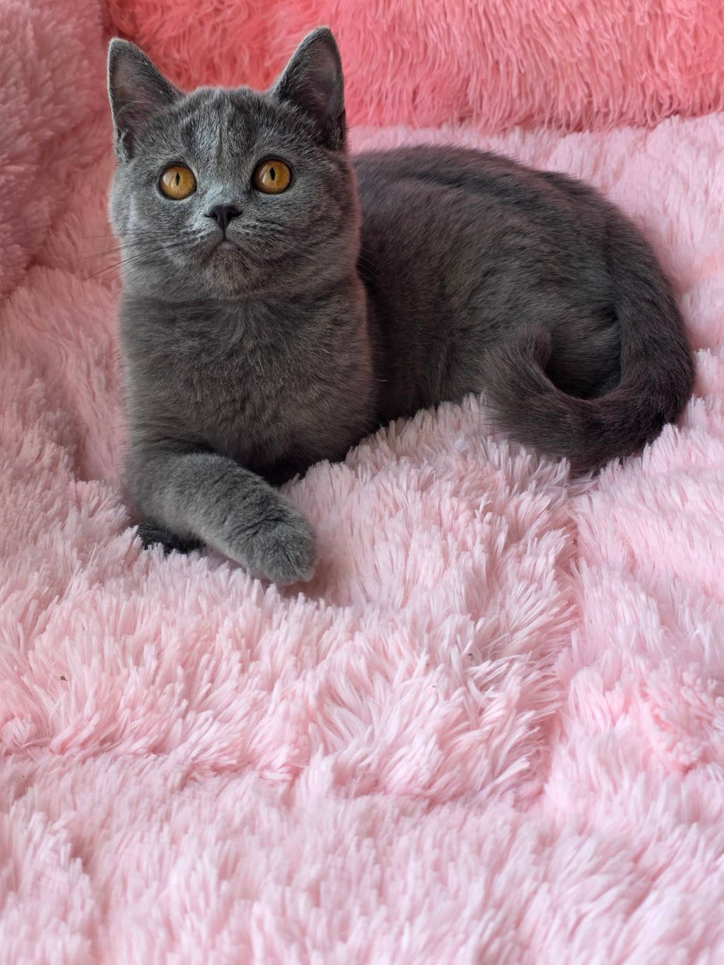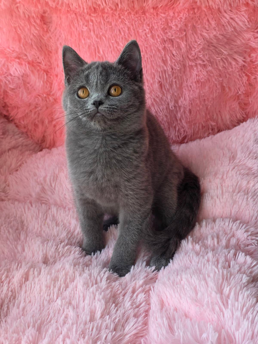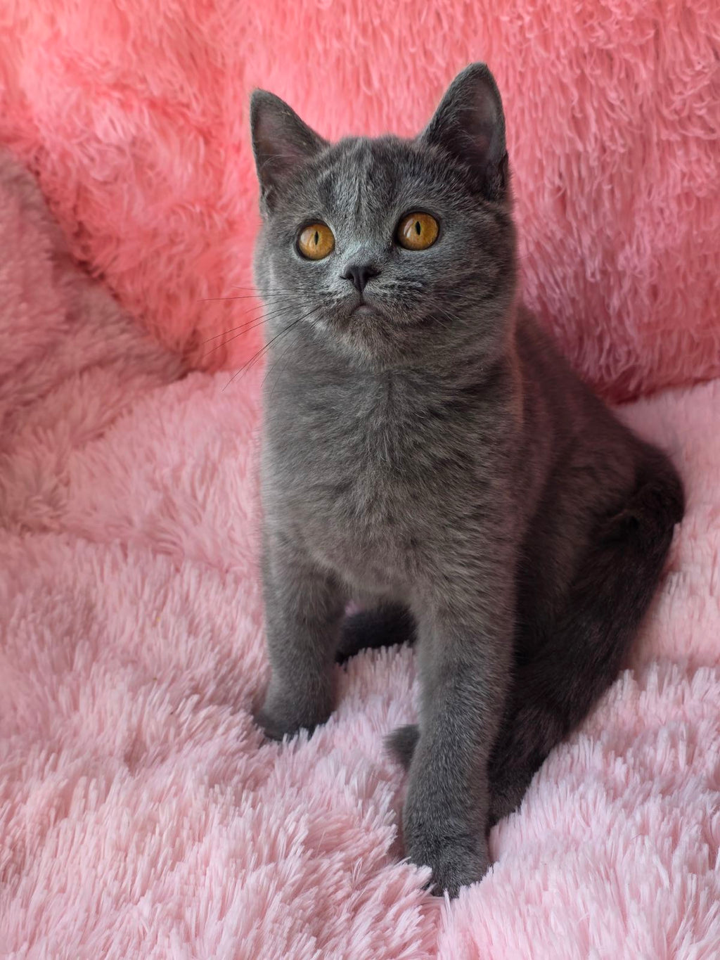 Caitlin is a distinguished female British Shorthair with a striking blue coat, exemplifying the breed's iconic dense and plush fur. Known for her calm temperament and balanced disposition, she makes an excellent companion for both families and seasoned cat enthusiasts. Her robust build and expressive copper eyes highlight the classic British Shorthair features, reflecting the breed’s well-established lineage and health standards. Caitlin offers a blend of elegance, affection, and resilience, making her a valuable addition for those seeking a refined feline companion.