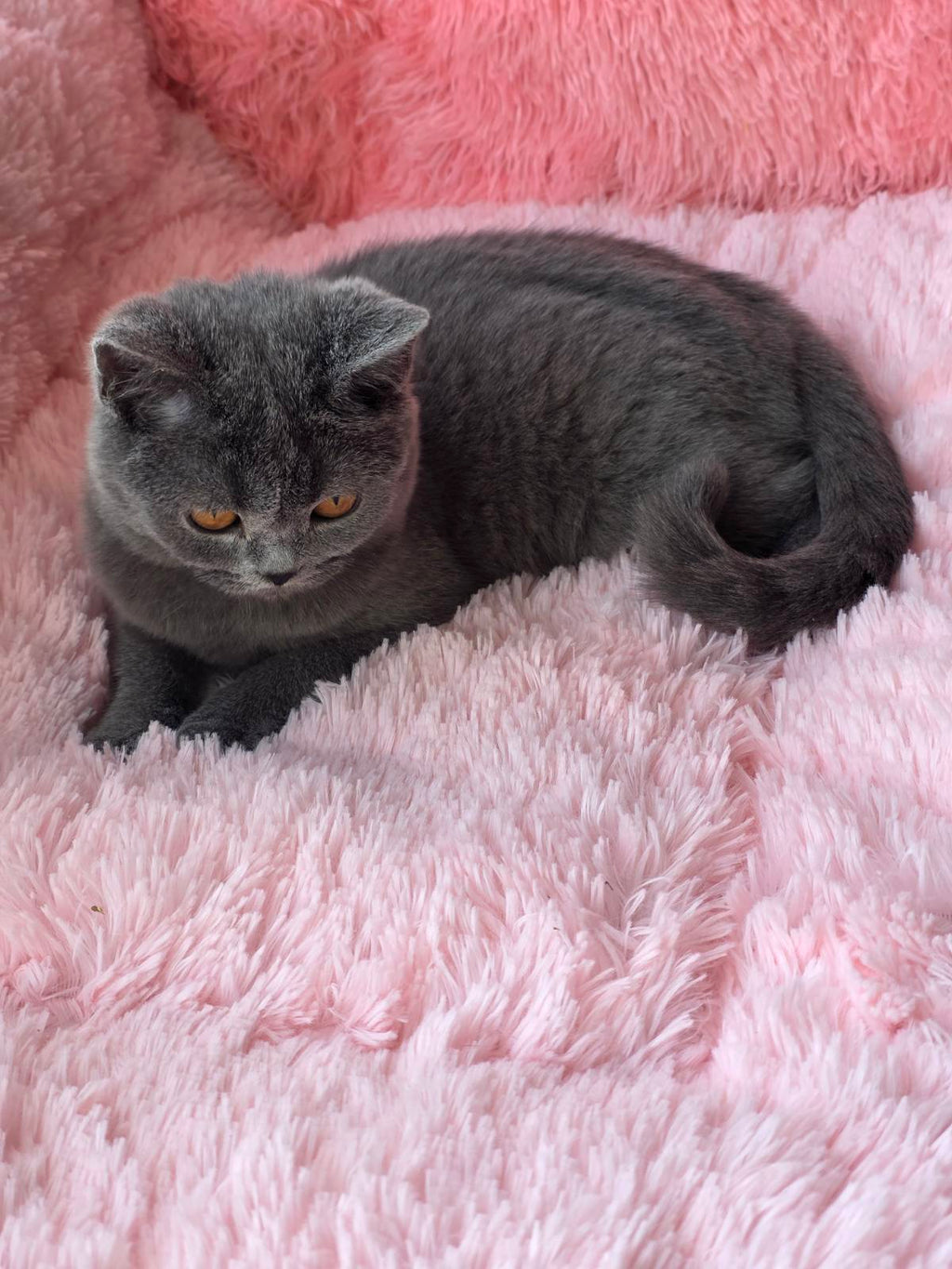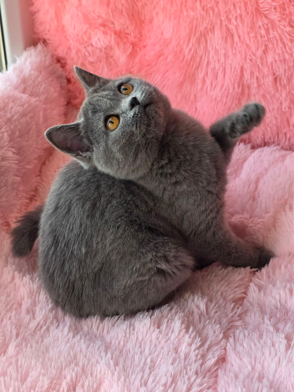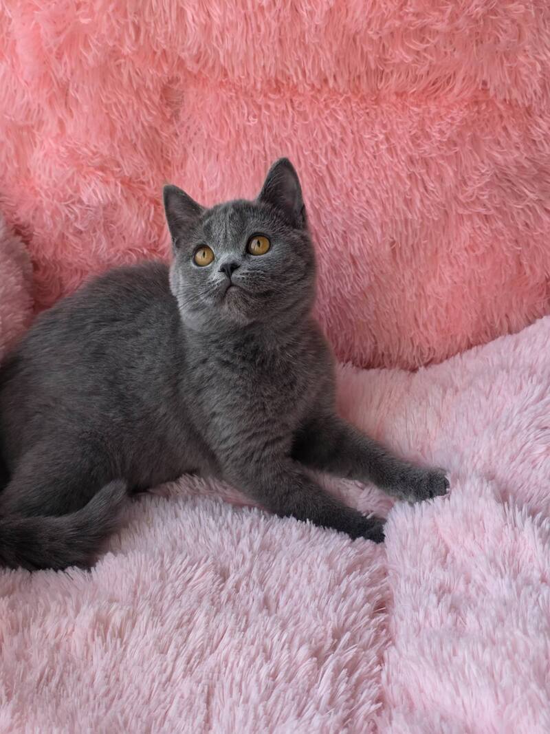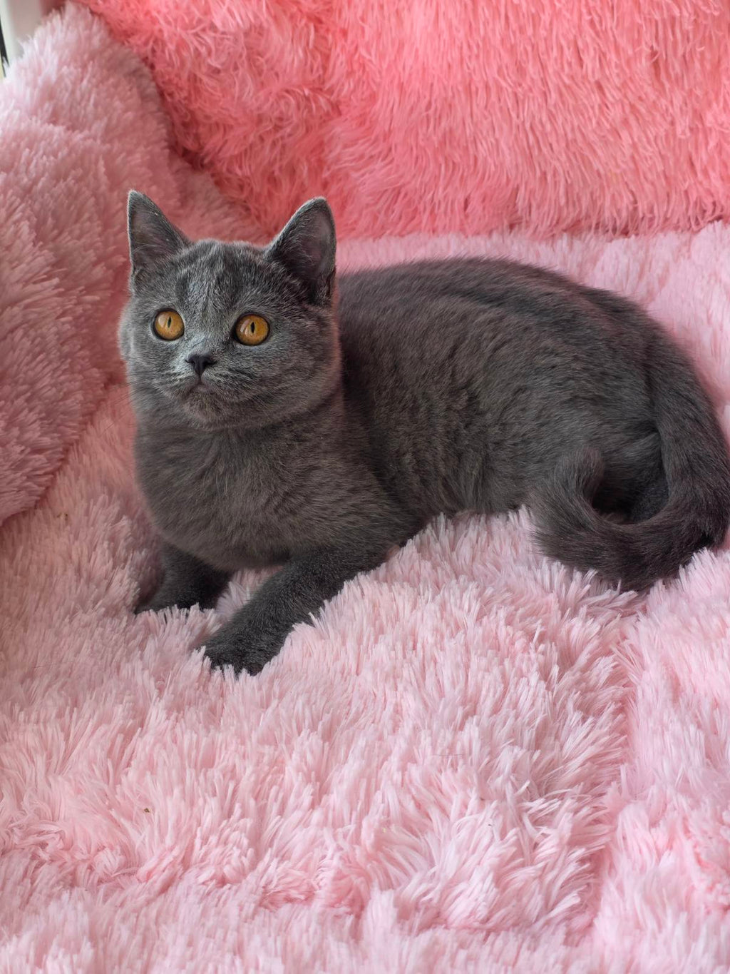 Caitlin is a distinguished female British Shorthair with a striking blue coat, exemplifying the breed's iconic dense and plush fur. Known for her calm temperament and balanced disposition, she makes an excellent companion for both families and seasoned cat enthusiasts. Her robust build and expressive copper eyes highlight the classic British Shorthair features, reflecting the breed’s well-established lineage and health standards. Caitlin offers a blend of elegance, affection, and resilience, making her a valuable addition for those seeking a refined feline companion.