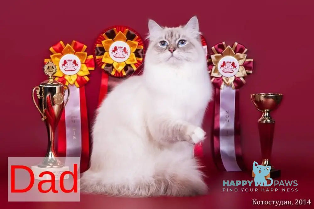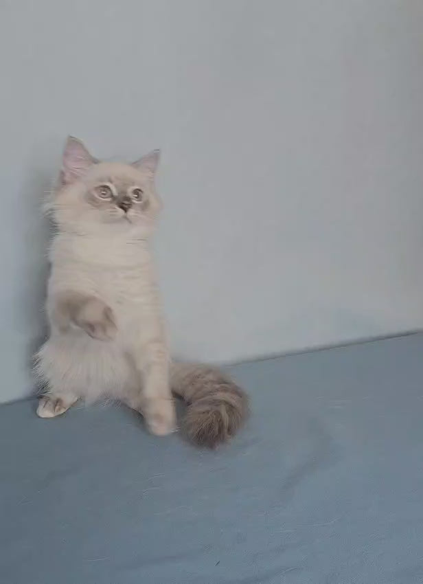 Calista is a stunning Siberian female showcasing the coveted blue with white tabby pointed coloration. This breed exemplifies elegance and intelligence, with a robust, muscular build characteristic of Siberians. Her striking blue-gray coat contrasts beautifully with white markings and distinctive tabby points, creating a visually captivating appearance. Siberians are known for their affectionate, playful temperament and adaptability to family life. With a semi-long, water-resistant coat and impressive athleticism, Calista combines beauty with an engaging personality. Ideal for those seeking a loyal, interactive companion with exceptional breed characteristics.