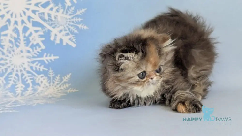 Meet Carmen, a stunning black tortie tabby Persian female with the classic beauty and gentle temperament the breed is renowned for. Her luxurious long coat showcases the rich blend of black and warm tortoiseshell tones that make this coloring so captivating. Carmen embodies the Persian breed's calm, affectionate nature, making her an ideal companion for those seeking a devoted and serene feline friend. Her striking appearance and sweet disposition promise years of companionship and joy.