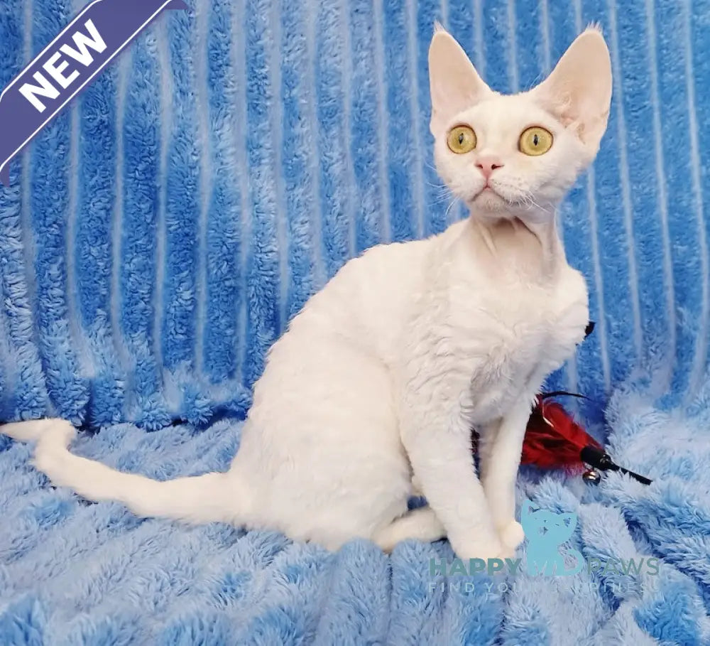 Meet Chanel, an exquisite white female Devon Rex kitten with the breed's signature elfin features and silky coat. Devon Rex cats are renowned for their playful, affectionate temperament and exceptional intelligence, making them ideal companions for interactive households. Chanel's striking appearance combines delicate bone structure with large ears and luminous eyes characteristic of the breed. These cats thrive on human companionship and enjoy being involved in daily activities. Her pristine white coat requires regular grooming to maintain its lustrous quality. As a Devon Rex, Chanel will mature into a moderately sized, muscular cat with boundless energy and curiosity. Perfect for families seeking an engaging, devoted feline companion with a distinctive look and spirited personality.