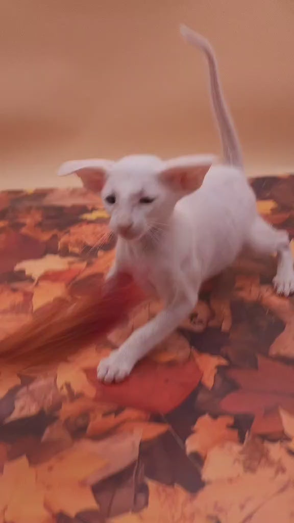 Clayton is an Oriental Shorthhair male with a pure white, sleek coat that highlights his elegant build. His almond-shaped eyes and refined features give him a graceful, almost statuesque presence. Curious and intelligent, he enjoys exploring his surroundings and engaging with people. Clayton’s gentle yet confident personality makes him both charming and affectionate.