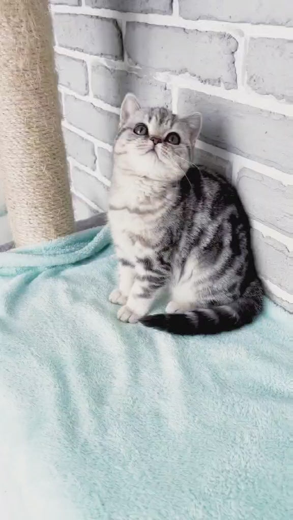 Meet Dakota, a stunning British Shorthair female with a luxurious black silver tabby coat. This breed is renowned for its calm, affectionate temperament and striking appearance, featuring the characteristic dense double coat and round face that defines the British Shorthair standard. Dakota's silver tabby markings showcase the breed's natural elegance and beauty. British Shorthairs are known for their independent yet devoted nature, making them excellent companions for families and individuals alike. With proper care and nutrition, these cats typically enjoy long, healthy lives and adapt well to various living environments.