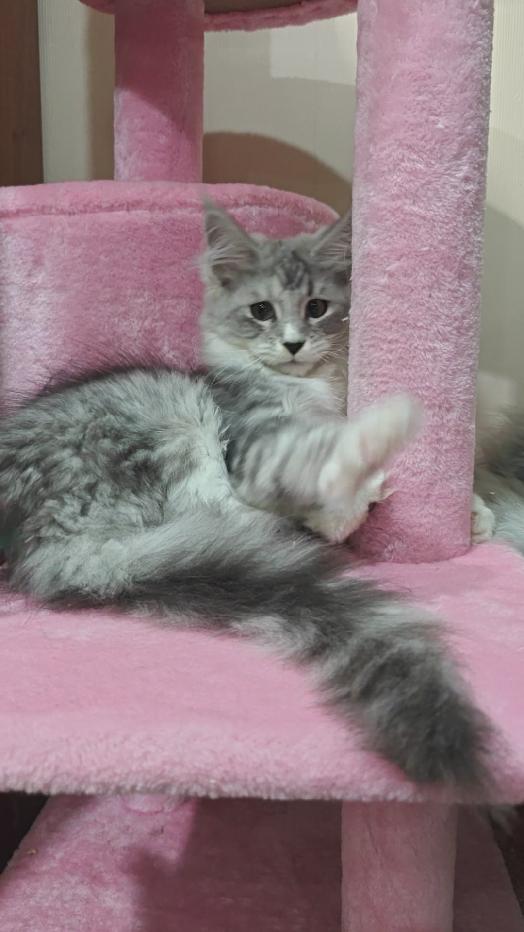 Dakota is a black silver spotted tabby Maine Coon female kitten, showcasing the breed’s distinctive large size, luxurious fur, and tufted ears. Her striking coat pattern highlights her wild ancestry, while her gentle temperament makes her an ideal companion. Perfect for those seeking a majestic yet affectionate feline, Dakota promises both beauty and personality in one exceptional pet.