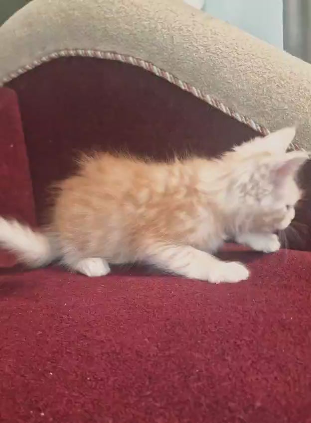 Meet Daniel, a striking male Maine Coon displaying the coveted red silver spotted tabby pattern. This majestic breed exemplifies the Maine Coon's renowned characteristics: substantial size, muscular build, and an intelligent, affectionate temperament. Daniel's distinctive red and silver spotted coat showcases the breed's natural beauty and requires regular grooming to maintain its lustrous appearance. Maine Coons are known for their gentle nature, making them excellent family companions despite their impressive stature. Daniel combines the breed's legendary hunting prowess with a surprisingly social and playful personality, thriving in interactive environments where he can engage with his human family.