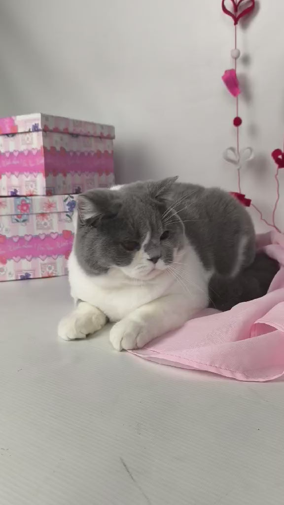 Meet Darik, a stunning British Shorthair male showcasing the coveted blue bicolour pattern. This breed is renowned for its robust build, dense plush coat, and calm, affectionate temperament. Darik displays the characteristic round face and sturdy frame typical of quality British Shorthairs, with striking blue-grey coloring complemented by white markings. British Shorthairs are known for their independent yet devoted nature, making them excellent companions for families and individuals alike. These cats adapt well to various living environments and typically enjoy a relaxed lifestyle. Darik represents the breed standard excellence, combining beauty with a gentle, easygoing personality that makes him an ideal addition to any loving home.