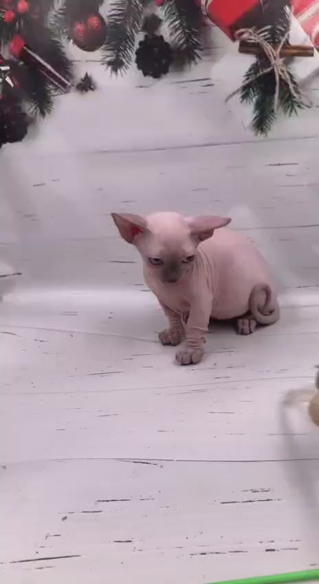The Dasha Bambino represents a refined choice for discerning cat enthusiasts seeking a distinctive feline companion. This female specimen displays the breed's characteristic blue pointed coloration—a striking contrast of pale silvery-gray body fur with darker blue-gray points on the ears, face, paws, and tail. Bambinos are known for their compact, muscular build and notably short legs, combined with large, alert ears that give them an endearing appearance. As a pointed variety, this cat exhibits the elegant color pattern associated with Siamese ancestry. Ideal for those appreciating a unique, affectionate breed with a playful temperament and manageable size.