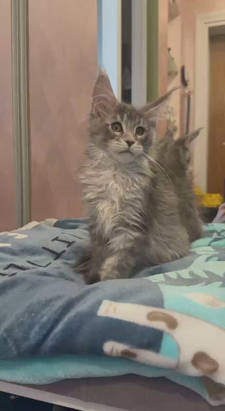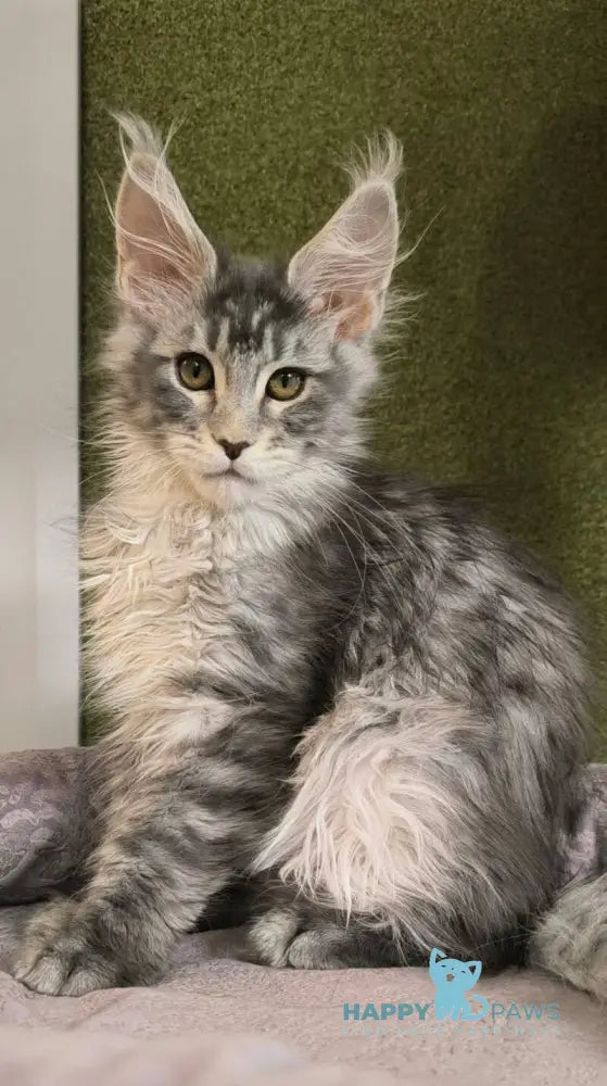 Delaila is a stunning female Maine Coon showcasing the coveted black silver tabby pattern. This majestic breed is renowned for its impressive size, intelligent temperament, and striking appearance. Maine Coons are known for their gentle, sociable nature and adaptability to family life. Delaila's luxurious silver-tipped coat and distinctive tabby markings exemplify the breed's natural elegance. As a purebred Maine Coon, she represents exceptional genetics and breed standards. Ideal for those seeking a companion that combines beauty, intelligence, and a calm, affectionate disposition.