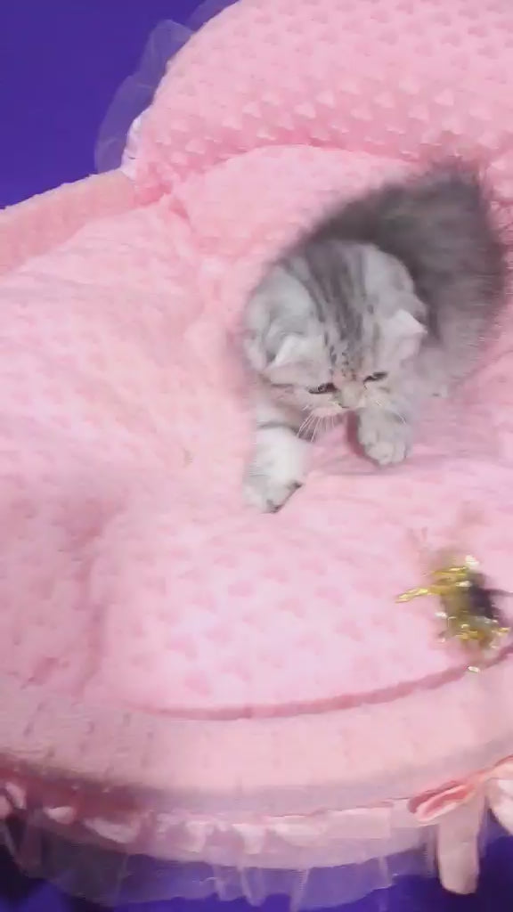 Meet Den, a striking Scottish Fold male with a luxurious black silver spotted tabby coat. This breed is renowned for its distinctive folded ears, which give Den an endearing, owl-like expression that cat enthusiasts find irresistible. Scottish Folds are known for their gentle temperament, adaptability to various living environments, and affectionate nature toward their families. Den's stunning spotted tabby pattern showcases the breed's natural beauty and genetic diversity. As a male Scottish Fold, he brings the breed's characteristic calm demeanor and playful curiosity to any home. Scottish Folds typically form strong bonds with their owners and thrive in environments where they receive regular interaction and mental stimulation.