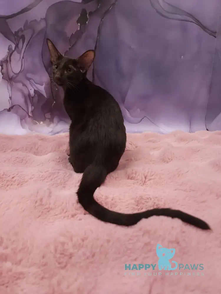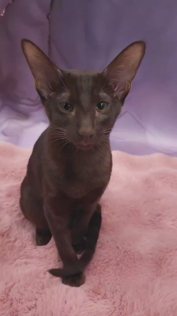 Denise is a chocolate-coloured Oriental Shorthair female with a warm, elegant look. Her sleek coat highlights her graceful build and refined features. She is curious and affectionate, often following her people from room to room. Denise has a gentle charm that makes her easy to adore.