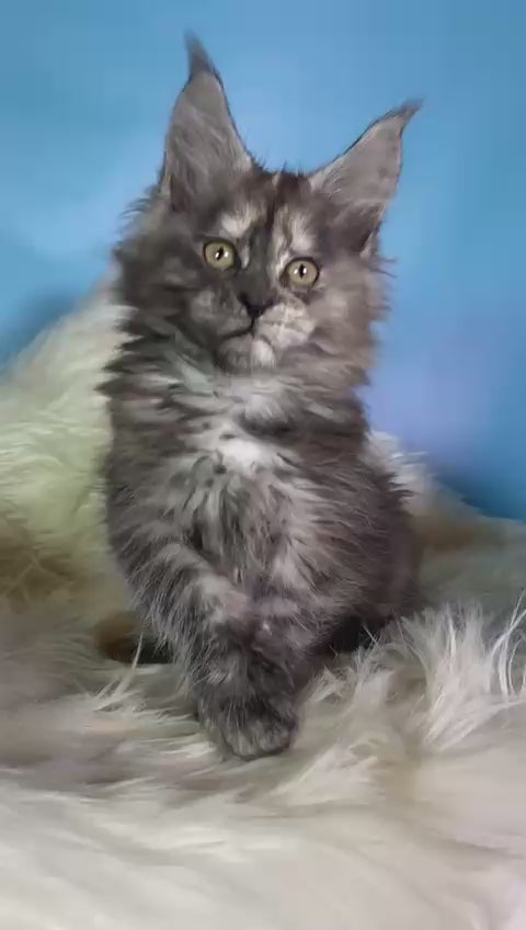 Diana is a stunning Maine Coon female showcasing the captivating black tortoiseshell silver coloring. This majestic breed is renowned for its impressive size, luxurious long coat, and gentle temperament. Maine Coons are intelligent, affectionate companions that thrive in family environments and adapt well to various living spaces. Diana's striking tortie silver pattern displays the breed's natural beauty and distinctive markings. Known for their playful yet calm demeanor, Maine Coons make exceptional pets for those seeking a loyal, interactive feline companion with remarkable personality and charm.