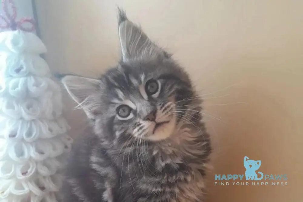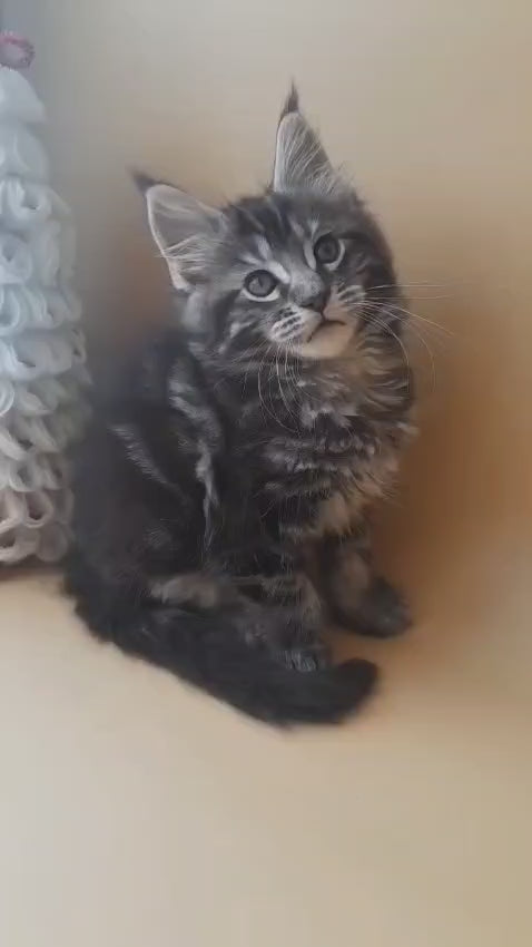 Dionysus is a striking male Maine Coon with a luxurious black silver tabby coat. This majestic breed is known for its impressive size, gentle temperament, and intelligent personality. Maine Coons are affectionate companions that thrive on human interaction and adapt well to family life. Dionysus combines the breed's characteristic charm with his distinctive silver-tipped markings, making him a captivating addition to any home. Perfect for those seeking a loyal, playful feline friend with a calm and sociable nature.