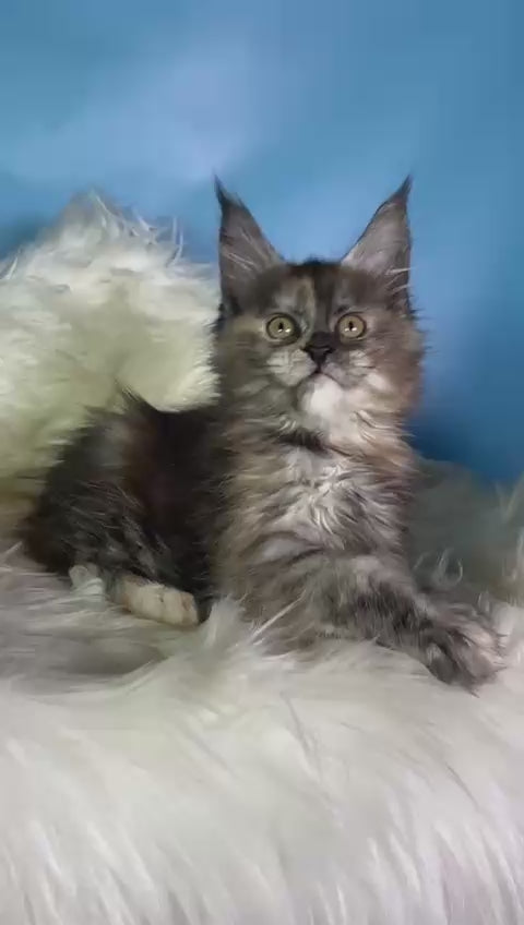 Dora is a striking Maine Coon female with a beautiful black tortie silver coat full of depth and contrast. Her tufted ears and bright eyes give her a bold yet gentle expression. Curious and affectionate, she enjoys exploring and staying close to her humans. Dora brings elegance, warmth, and personality to any home.