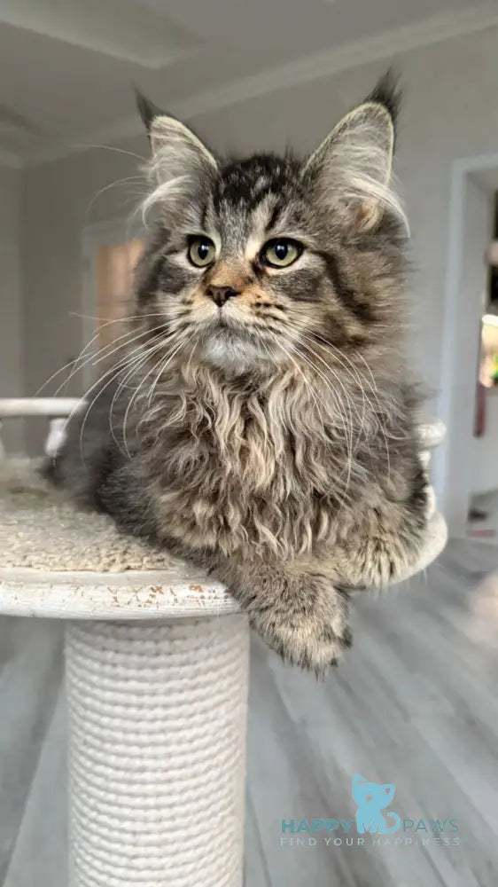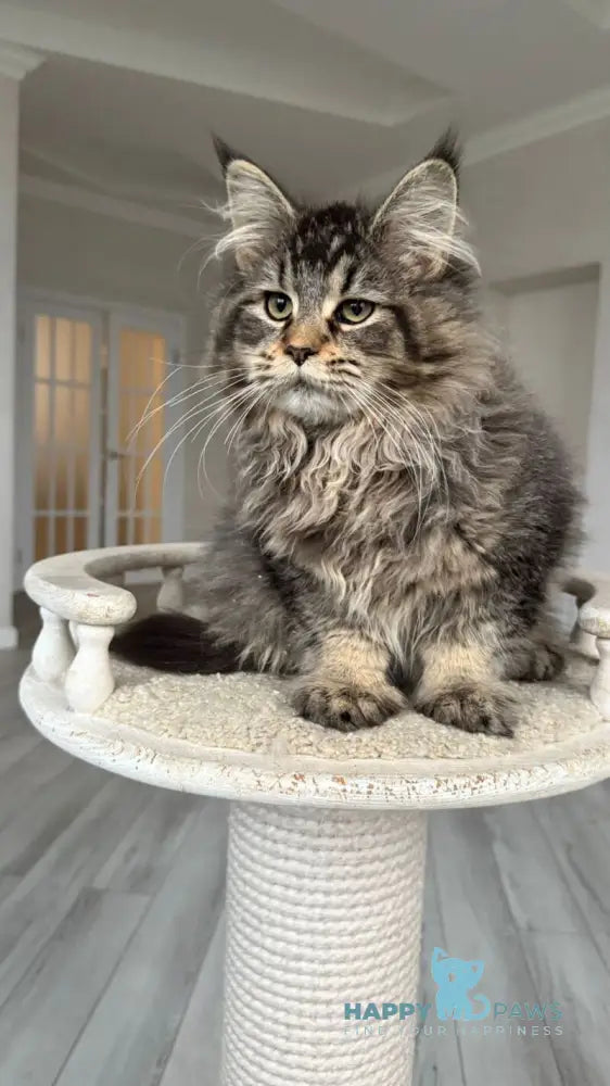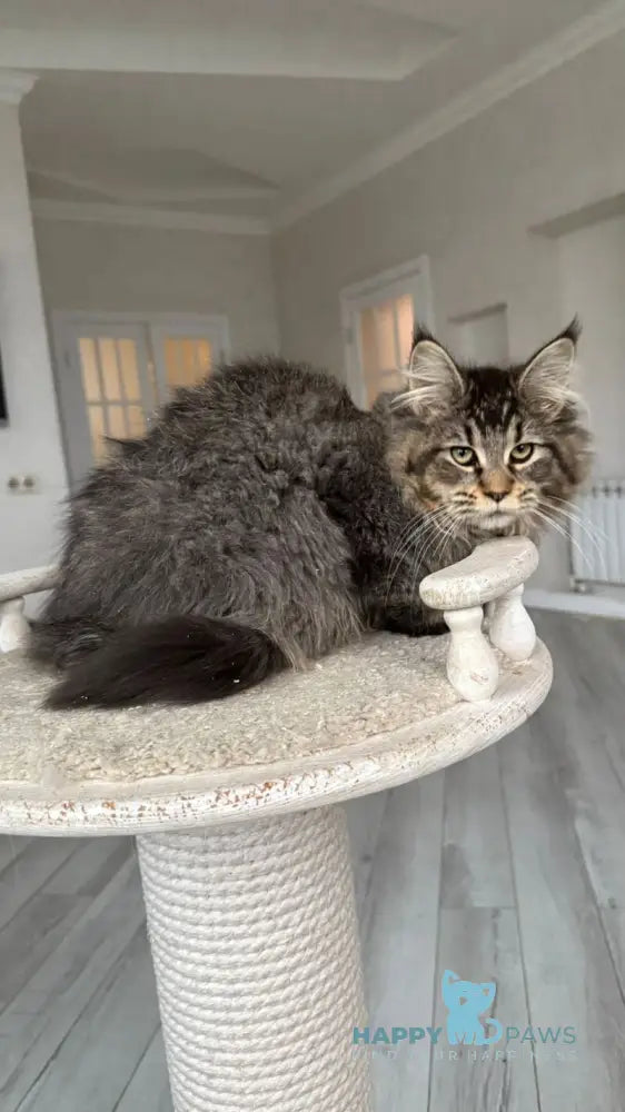 Ivi is a striking black tabby Maine Coon with a bold pattern and expressive eyes. Her long, flowing coat and tufted ears highlight her strong yet elegant build. She has a confident, independent nature, but shows deep affection toward those she trusts. Calm and observant, she brings a quiet strength to her surroundings.