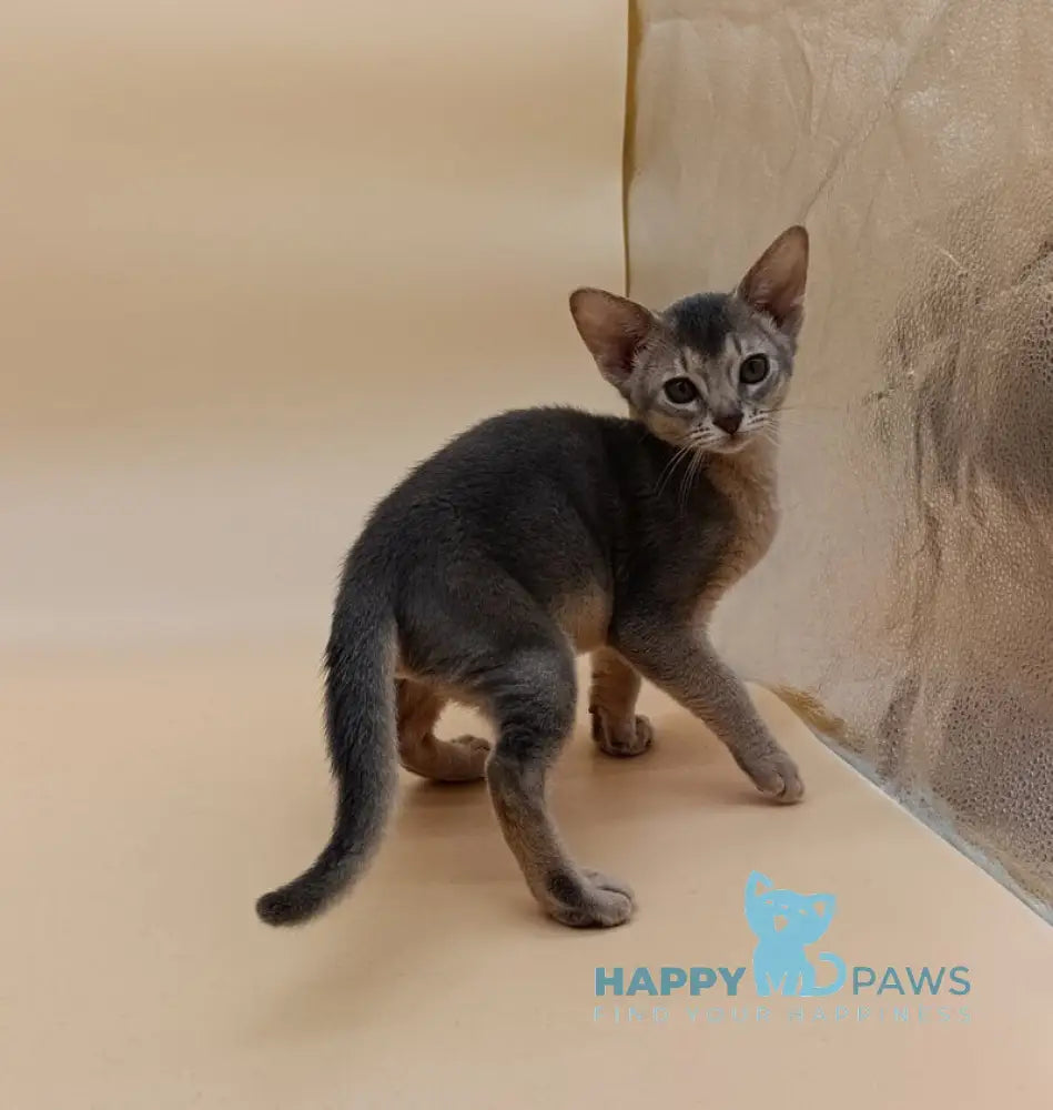 Meet Eddy, a striking blue Abyssinian male with the breed's signature ticked coat and alert, intelligent demeanor. Abyssinians are renowned for their muscular build, large ears, and vibrant personalities. Eddy displays the characteristic warm ruddy undertones of the blue variety, creating a sophisticated appearance. These cats are highly active, curious, and form strong bonds with their families. Known for their playful nature and vocal communication, Abyssinians thrive in interactive environments where they can engage with their owners. Eddy makes an excellent companion for those seeking a devoted, energetic feline friend.