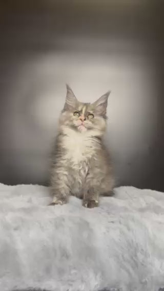 Emiliya is a stunning blue tortie silver Maine Coon female, showcasing the breed's distinctive characteristics with exceptional coloring. Maine Coons are renowned for their impressive size, intelligent temperament, and affectionate nature, making them ideal companions for families and experienced cat enthusiasts. Her blue tortie silver coat displays a sophisticated blend of cool-toned hues, a hallmark of premium Maine Coon genetics. This breed excels as both a devoted household pet and show-quality specimen, known for their playful yet gentle demeanor, adaptability to various living environments, and strong bonds with their owners. Emiliya represents the finest qualities of the Maine Coon lineage.