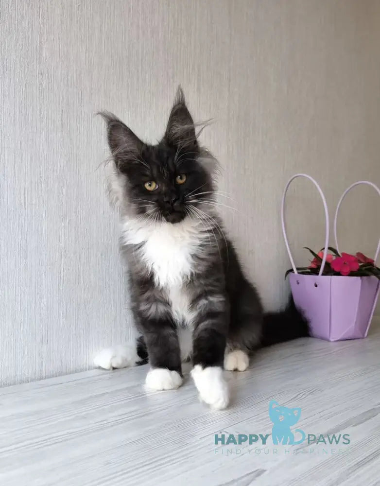 Emily is a female Maine Coon kitten boasting a striking black silver bicolour coat. Known for their gentle temperament and impressive size, Maine Coons like Emily make affectionate and intelligent companions. Her unique coloration highlights the breed’s distinctive long fur and tufted ears, reflecting both beauty and breed authenticity. Ideal for those seeking a loyal and elegant pet, Emily combines exceptional genetics with a calm, sociable nature.