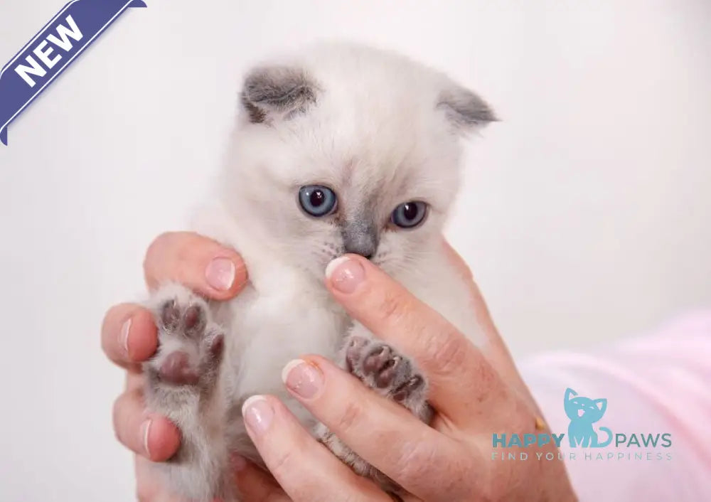 Emma is a female Scottish Fold with distinctive blue pointed markings, showcasing the breed's signature folded ears and plush coat. Known for their gentle and adaptable nature, Scottish Folds like Emma make affectionate companions. Her blue pointed coloration adds a striking contrast to her soft fur, enhancing her unique appearance. Ideal for cat lovers who appreciate a calm and loving pet, Emma brings both charm and tranquility to any home.