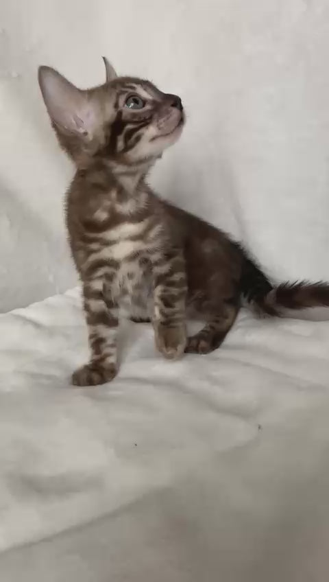 Meet Erik, a stunning black amber spotted tabby Bengal male with the distinctive wild appearance that makes this breed so captivating. His striking coat features rich black spots set against a warm amber background, creating the signature contrast that Bengal enthusiasts adore. Erik embodies the breed's athletic build and intelligent temperament, combining the exotic look of his wild ancestry with a domesticated, affectionate personality. Perfect for experienced cat owners seeking a highly interactive and engaging companion, Erik brings energy, playfulness, and remarkable loyalty to his home. His spotted pattern and muscular frame showcase the hallmark traits that make Bengal males prized among discerning feline lovers.