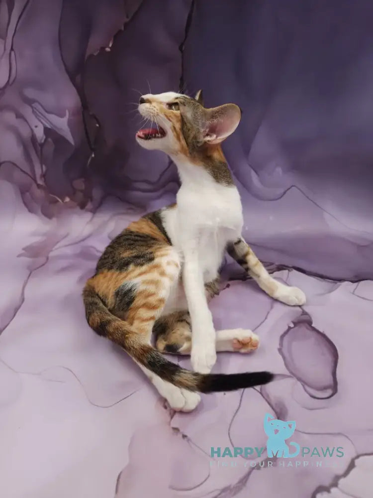 Esme is an Oriental Shorthair female with a striking black tortie bicolour spotted tabby coat. Her sleek, elegant body and large expressive eyes give her a distinctive, graceful look. She is lively, talkative, and loves being the center of attention. Esme’s playful spirit and affectionate nature make her a delightful companion.
