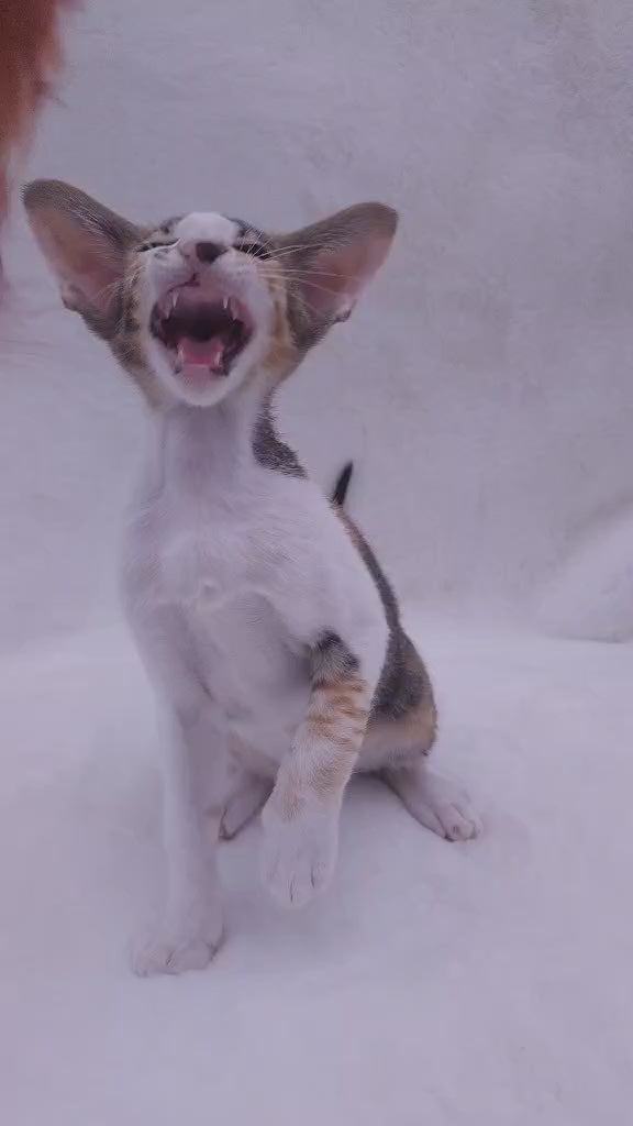 Esme Oriental Shorthair female, black tortie bicolour spotted tabby