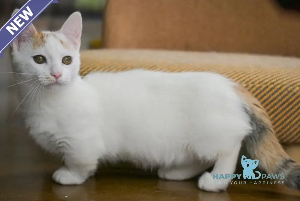 Meet Esmina, a stunning black tortie van Munchkin female with a distinctive coat pattern that combines rich black and warm tortoiseshell hues with striking white markings. This petite breed is known for its characteristically short legs and playful, affectionate temperament. Esmina's unique coloring and van pattern—where white extends across her head and body—make her a visually captivating companion. Munchkins are intelligent, social cats that thrive on interaction and enjoy exploring their environment despite their compact stature. Perfect for those seeking a charming, engaging feline with an unmistakable appearance and loving personality.