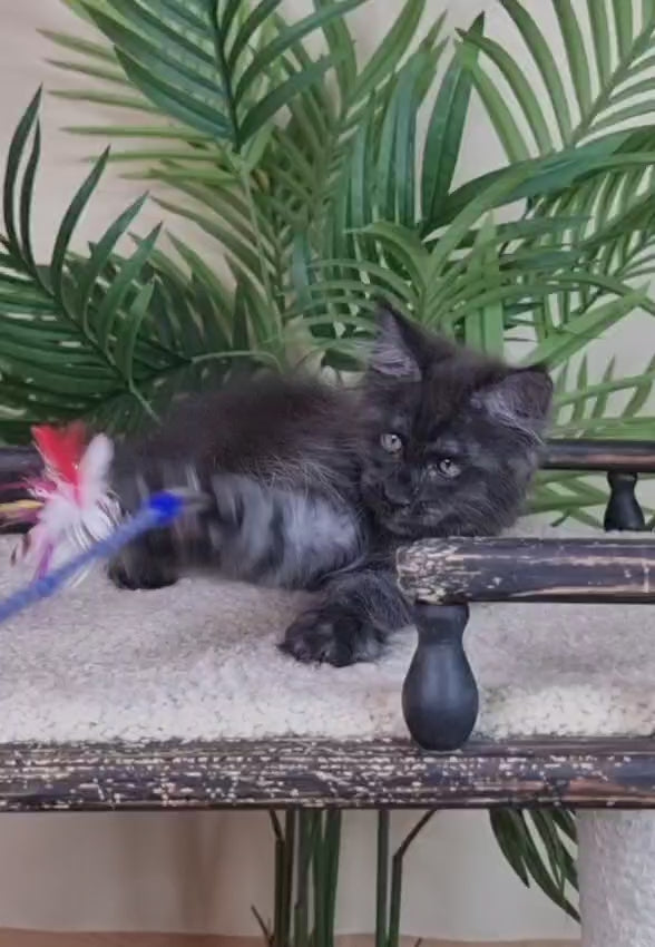 Everest represents the pinnacle of Maine Coon breeding excellence. This striking black silver male embodies the breed's most coveted characteristics: a robust, muscular frame, luxurious long coat with distinctive silver tipping, and the intelligent, affectionate temperament Maine Coons are renowned for. His impressive size and commanding presence are balanced by a gentle, sociable nature that makes him an exceptional companion. Everest's pedigree and physical attributes make him an outstanding choice for families seeking a premium feline companion with both beauty and substance.