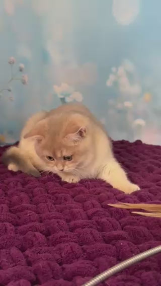Introducing Fanatic, a remarkable Scottish Straight male showcasing the breed's hallmark characteristics with his striking blue golden shaded coat. This distinguished feline features the signature straight ears and muscular frame that define the Scottish Straight standard. His luxurious blue golden coloring displays rich, warm tones that enhance his overall presence and appeal. Known for their composed demeanor and strong bonds with their families, Scottish Straights like Fanatic thrive in diverse household settings. His combination of impressive physical attributes and the breed's renowned intelligence and loyalty makes him an exceptional choice for those seeking a premium pedigree companion with both visual elegance and outstanding temperament.