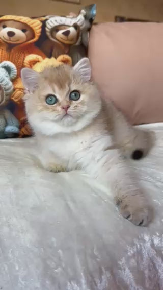 Meet Fialka, an exquisite British Shorthair female showcasing the rare and coveted black golden shaded coat pattern. Her luxurious fur displays a stunning gradient effect, with deep black tipping that transitions to warm golden undertones, creating a sophisticated and luminous appearance. British Shorthairs are renowned for their calm temperament, robust health, and striking round faces with full cheeks. Fialka combines these breed hallmarks with her distinctive coloring, making her a truly exceptional companion. Ideal for those seeking a gentle, intelligent feline with striking aesthetic appeal and a stable, affectionate personality.