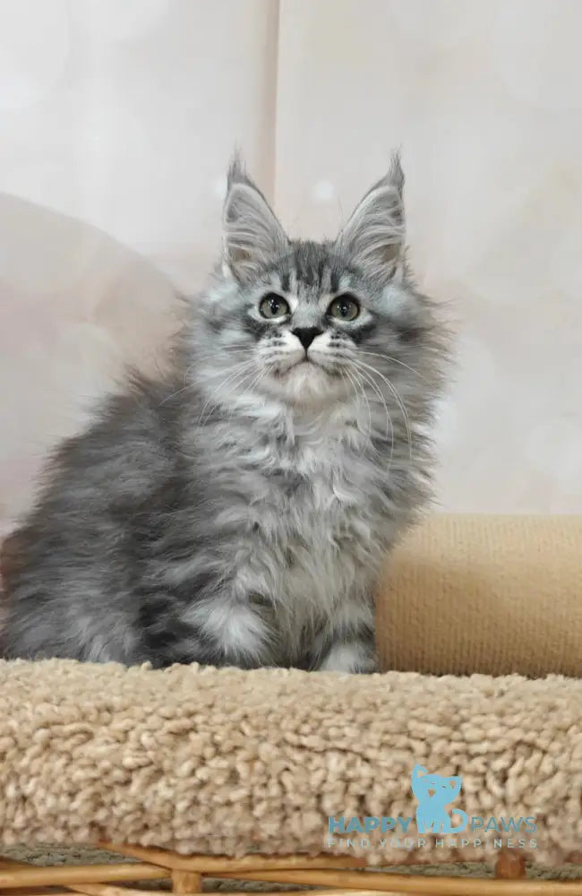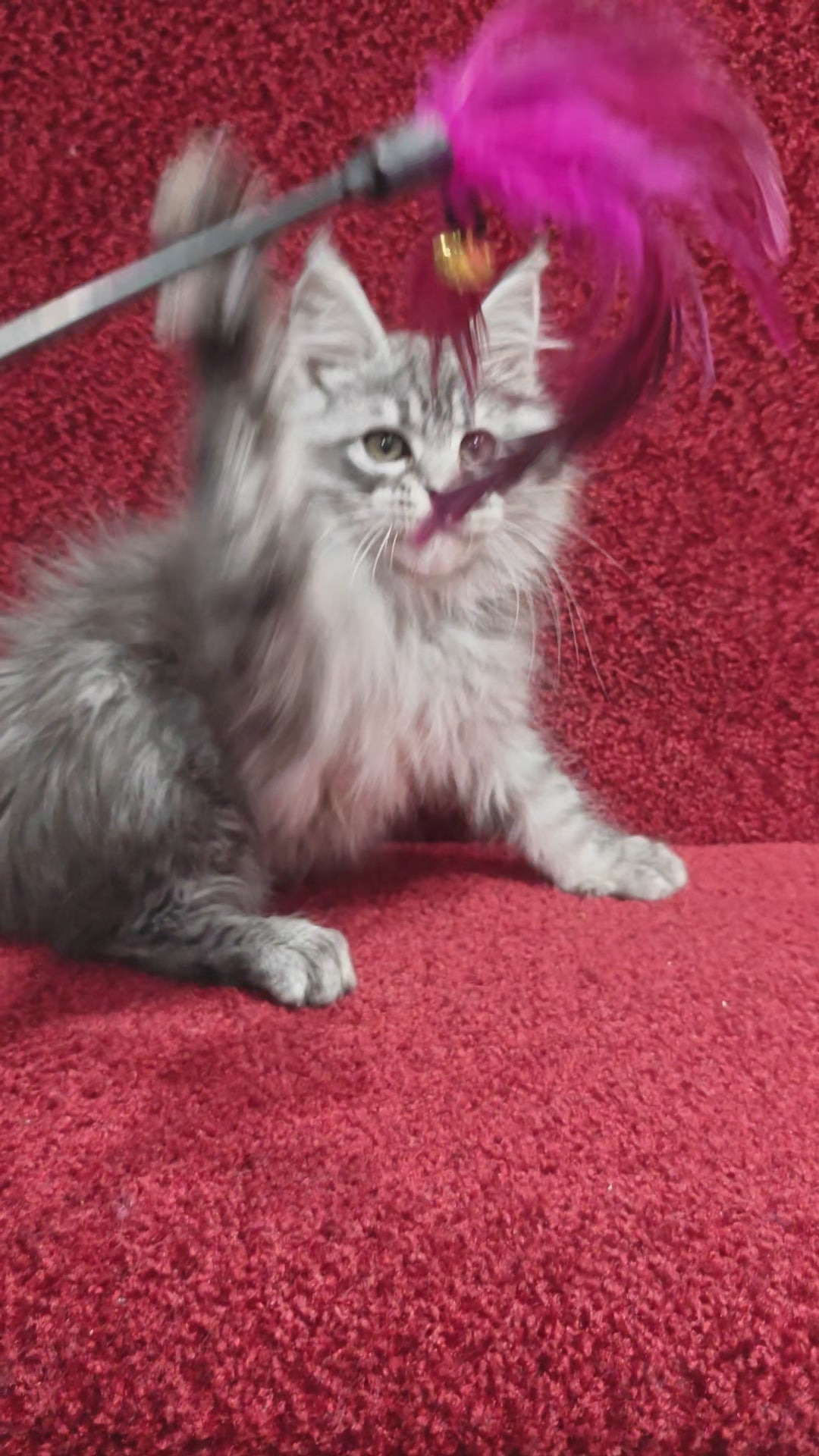 Fleur is a stunning female Maine Coon displaying the coveted black silver spotted tabby pattern. This majestic breed is renowned for its impressive size, muscular build, and luxurious long coat that showcases her distinctive markings beautifully. Maine Coons are intelligent, affectionate companions known for their gentle temperament and playful nature, making them excellent family pets. Fleur's striking silver-tipped fur and bold tabby spots create a captivating appearance that turns heads. As a purebred Maine Coon, she embodies the breed's characteristic tufted ears, bushy tail, and strong bone structure. Perfect for those seeking a loyal, engaging feline companion with exceptional beauty and personality.
