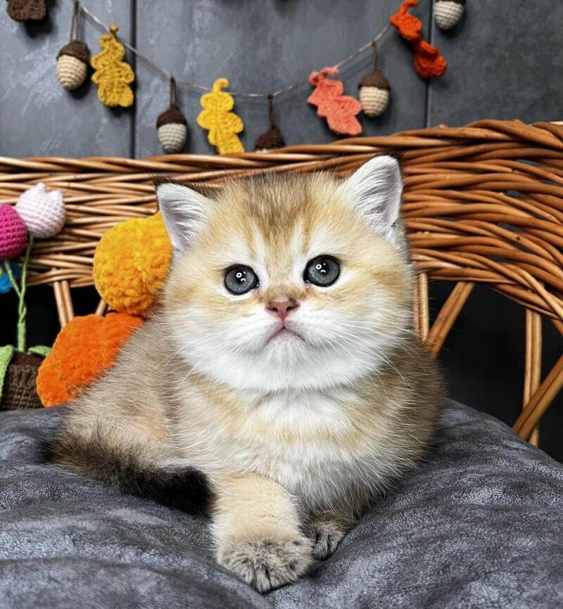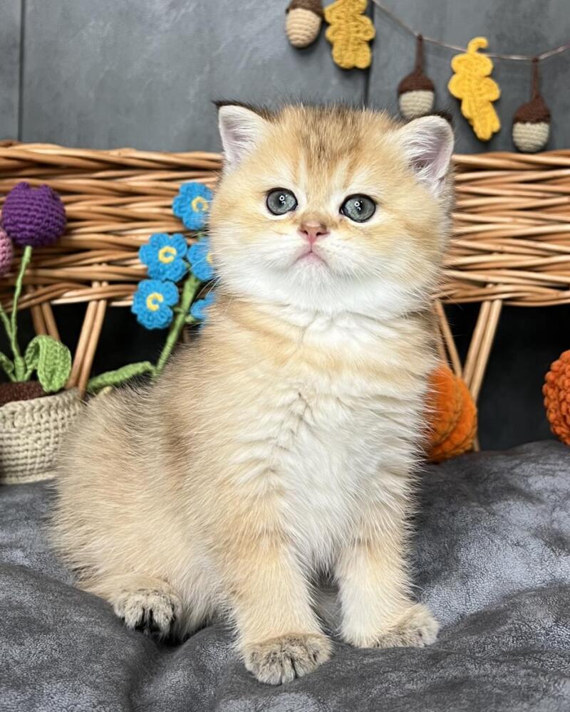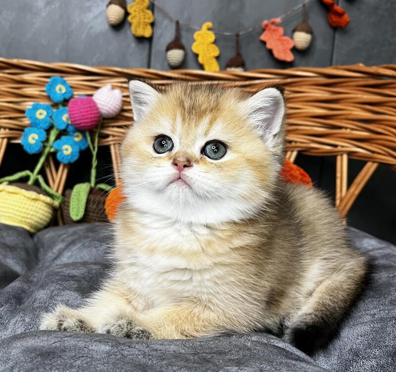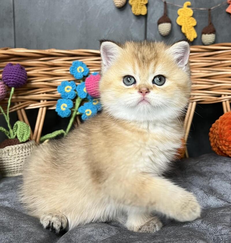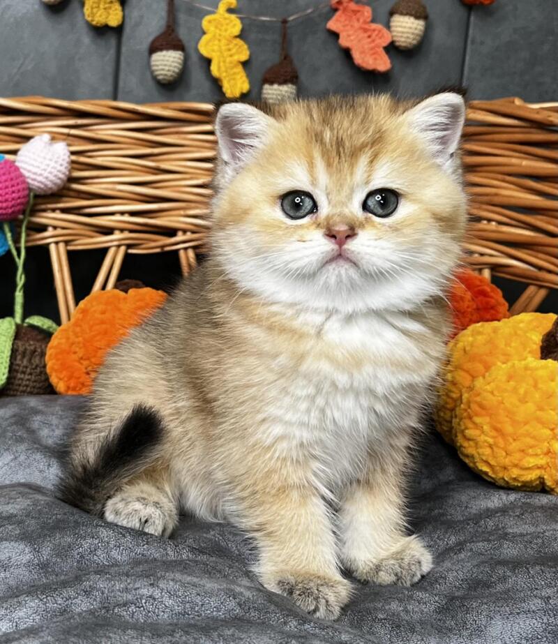 Flora is a stunning Scottish Straight female with a luxurious black golden shaded coat that showcases exceptional depth and richness. Her striking appearance combines the breed's characteristic rounded features with an elegant, well-proportioned build. This beauty displays the refined temperament Scottish Straights are known for—intelligent, affectionate, and adaptable to family life. Flora's distinctive coloring, with its sophisticated gradient from darker roots to golden highlights, makes her a truly captivating companion. Ideal for those seeking a graceful, even-tempered feline with striking visual appeal and a calm, devoted personality.