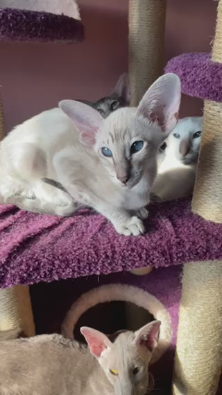 Flora is a graceful blue Siamese with sleek fur and striking blue eyes that seem to sparkle with intelligence. She’s affectionate and curious, always eager to be close to her favorite person. Her gentle voice and elegant movements add to her charm. Flora’s loving and loyal nature makes her a wonderful companion.